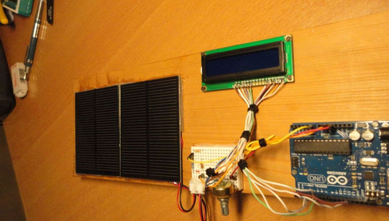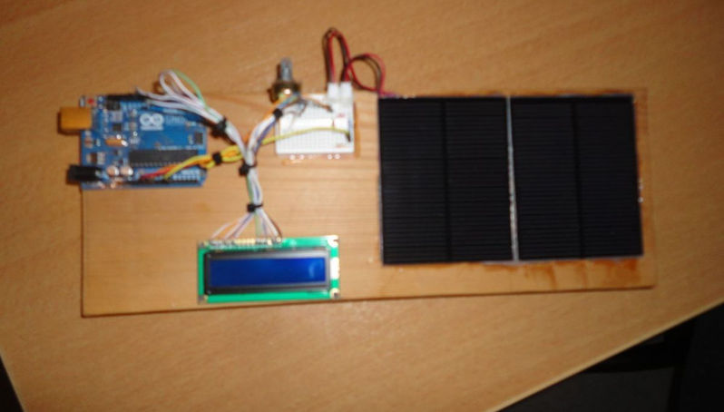 My solar power meter consists of very few components: An arduino uno board, an LCD display, a potentiometer, two solar panels connected in series and a voltage devider. It works as follows: after being turned on, it displays a short text on the LCD, (my name) and then displays the voltage, the current and the power that the solar panels produce. The only problem I faced while making this project was that the two solar panels connected in series were generating up to 12V, while the arduino analog ports can read voltages up to 5 volts. In order to overcome this problem, I made a voltage divider with a ratio of about 1:3. The arduino then reads the lower voltage and multiplies the value with the ratio of the voltage divider. Knowing the value of the resistance of the circuit and the voltage at the ends of the solar panels, we can easily determine the current and power of the solar panels. This is what I have programmed the arduino to do. The potentiometer is used to easily adjust the display’s contrast.